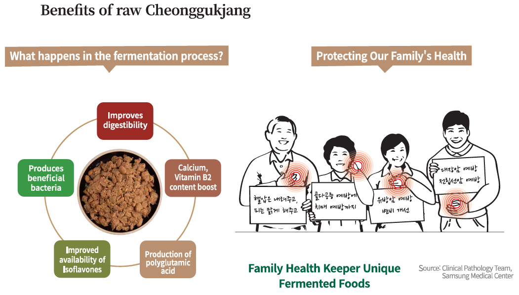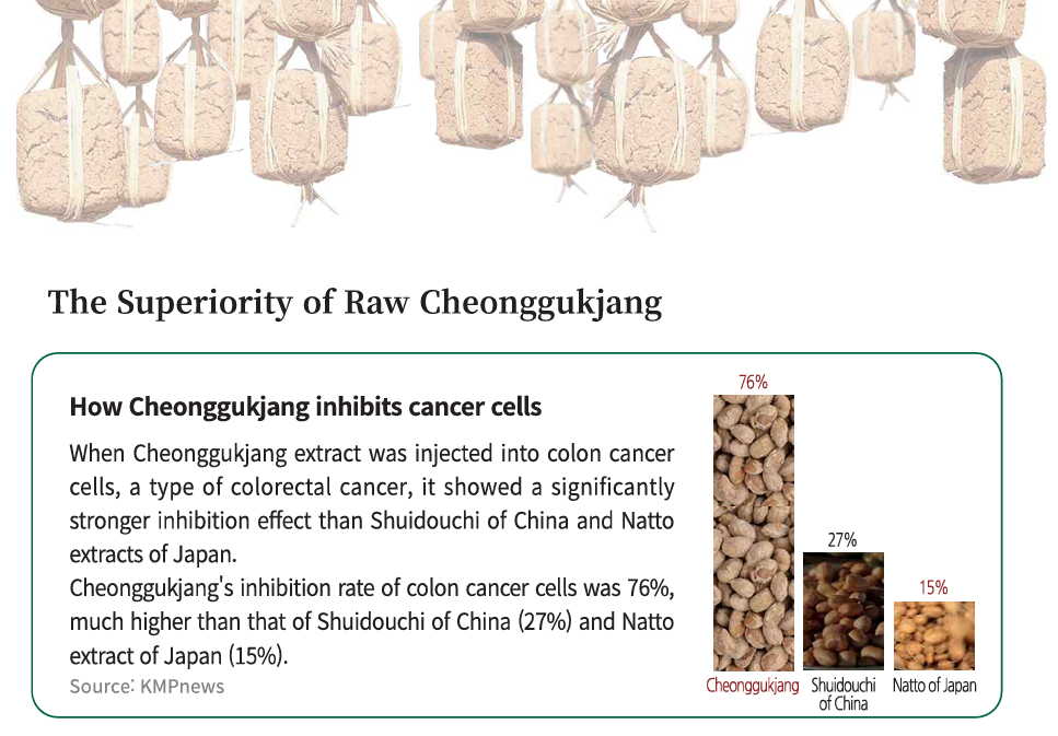 - Helps prevent cancer with its antioxidant effect : Soybeans, the raw material for Cheonggukjang, have antioxidant and anti-cancer effects Isoflavone, Phenolic compound, Pytic acid, Saponin Contains various bioactive substances such as . Isoflavone has harmful activity. Breast cancer by removing oxygen, Colon Cancer, Prostate cancer prevention effect